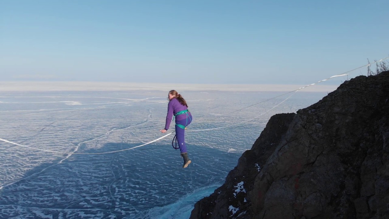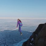 a brave girl walks a tightrope over an abyss. Cape Khoboy, Lake Baikal, Olkhon Island