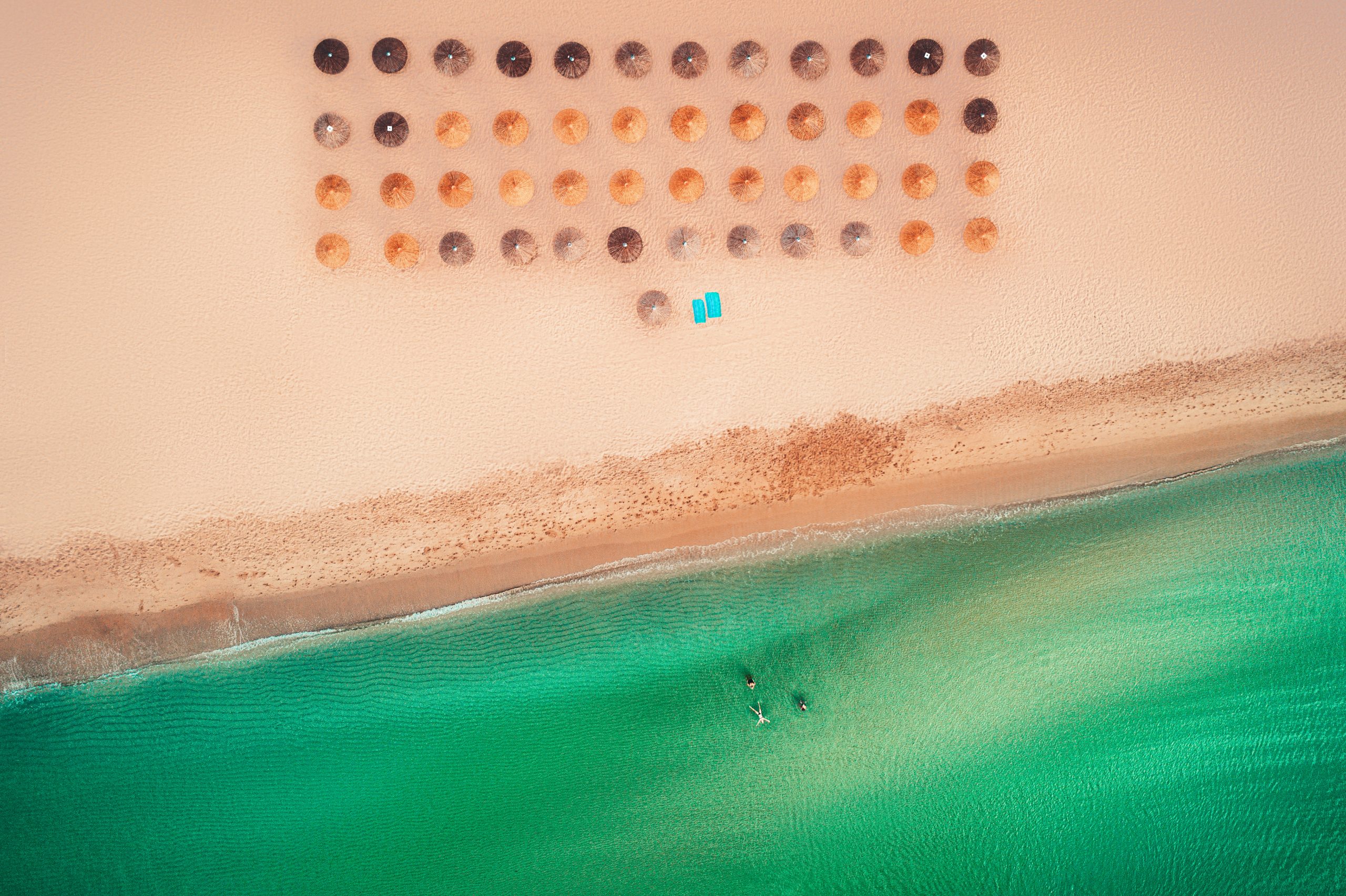 Aerial top view on the beach. Umbrellas, sand and sea waves