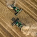 Two combines pass one another while harvesting a field of wheat!