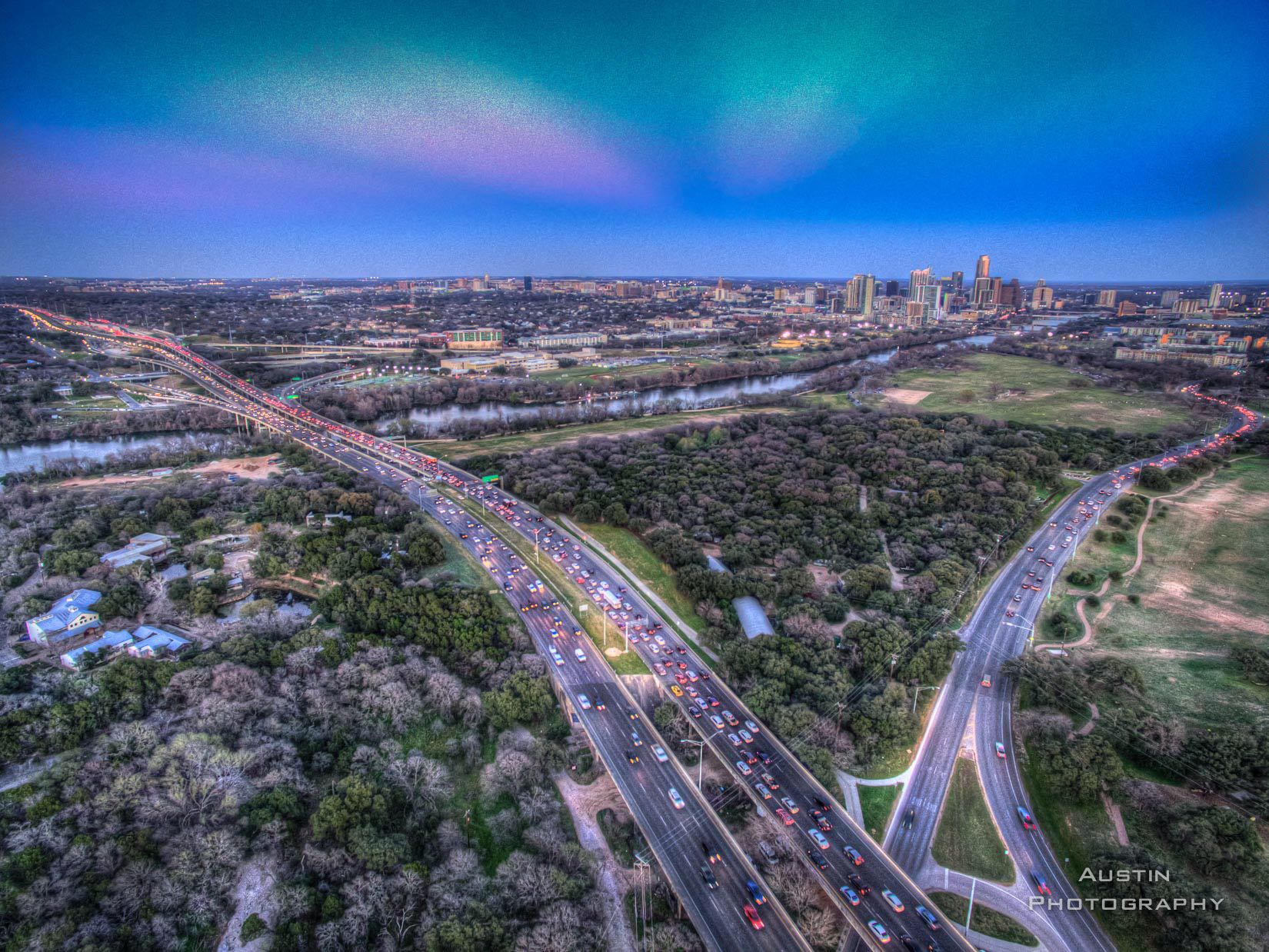 Sunset looking at down Austin with rush hour traffic.