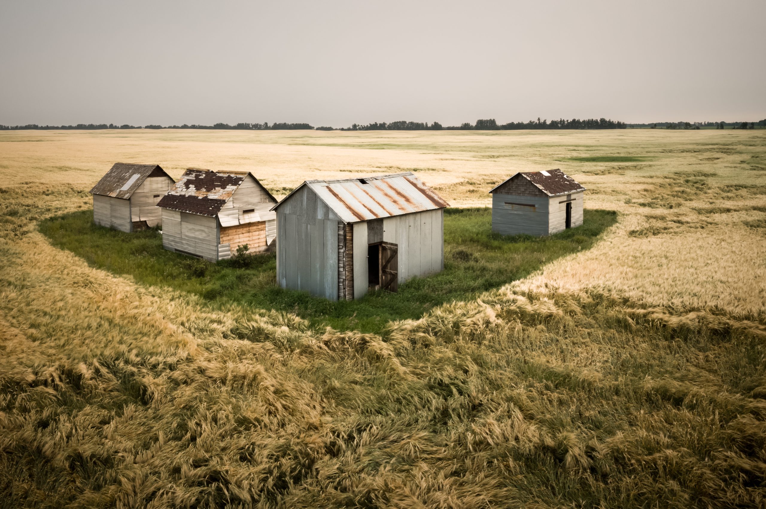 Farm outbuildings, maybe for grain storage. They have seen better days for sure! Sepia feel due forest fire haze drifting east from British Columbia.
