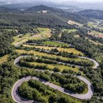 Aerial view of road with hairpin turns in Bieszczady mountains