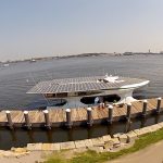 A shot of the largest solar powered boat sitting at the dock in Boston harbor.