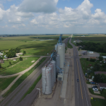Close flyby of towering grain elevators along US 50 (Lincoln Highway).