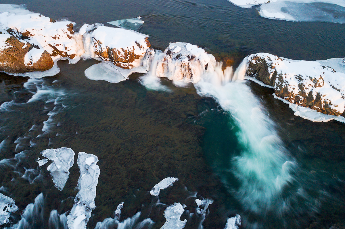 Part of this waterfall is frozen by frost and snow. Another part is ‘frozen’ by long exposure (0,6 seconds). Phantom 4 Pro at F7.1 with a ND16 filter to reduce the light. Waterfall in Iceland just before sunset.