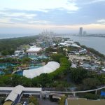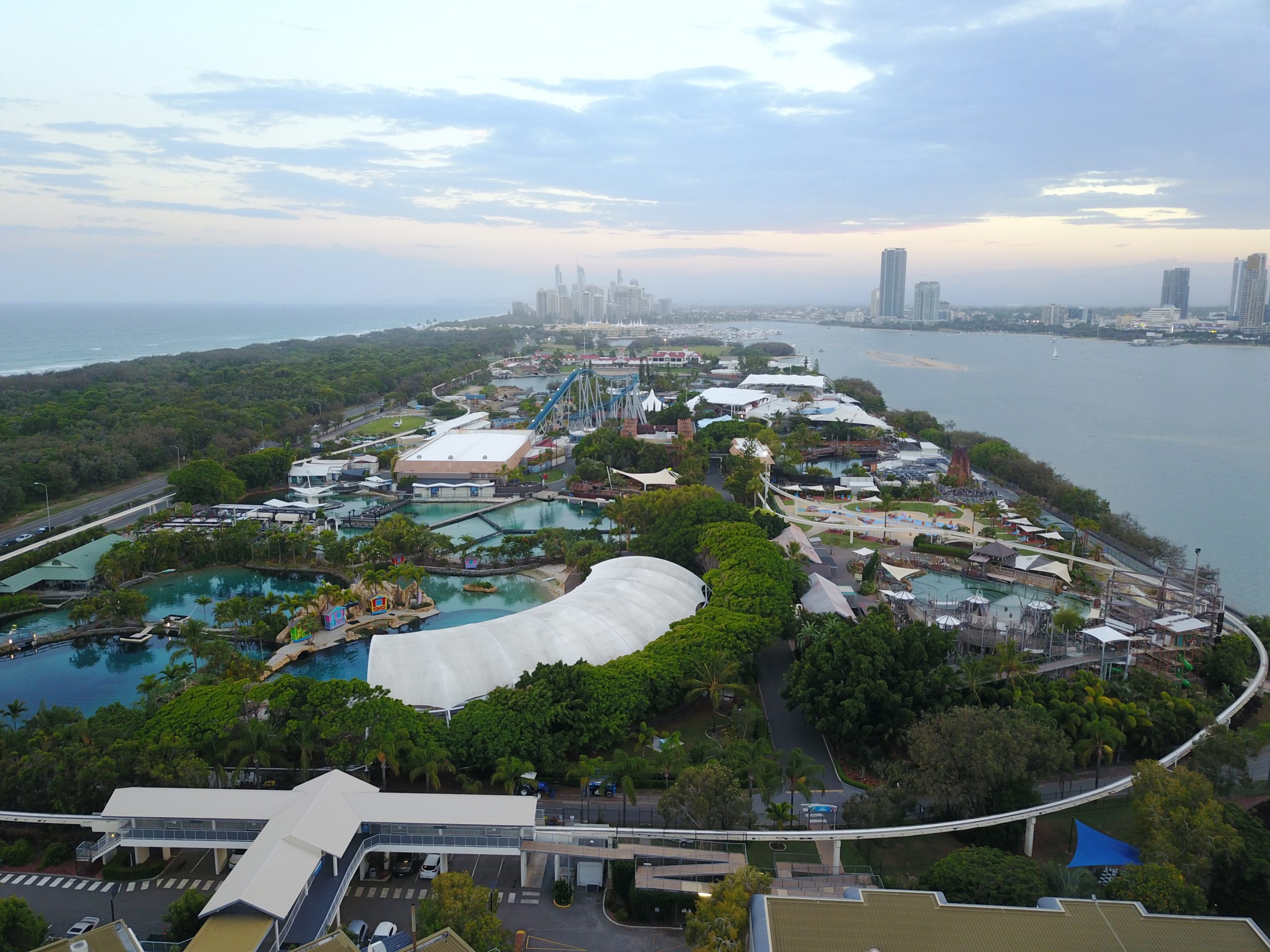 An aerial view of the goldcoast SeaWorld park and the city