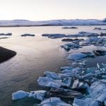 Aerial view of icebergs floating in Jokulsarlon Lagoon by the southern coast of Iceland