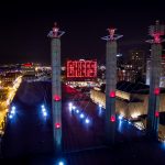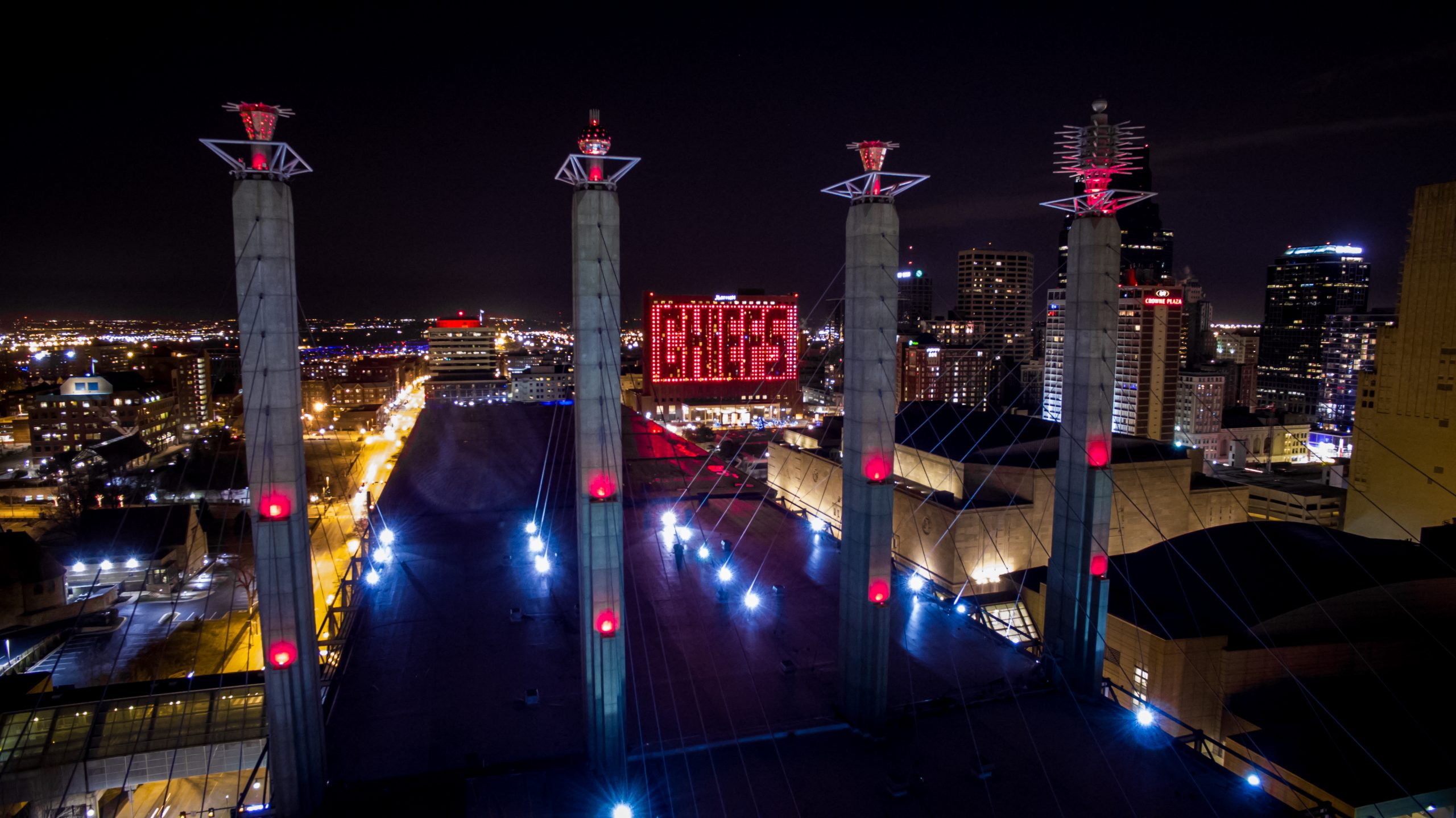 During the Chiefs brief playoff run, downtown Kansas City lit up red in order to show support! These pillars sit atop Bartle Hall and lit up red!