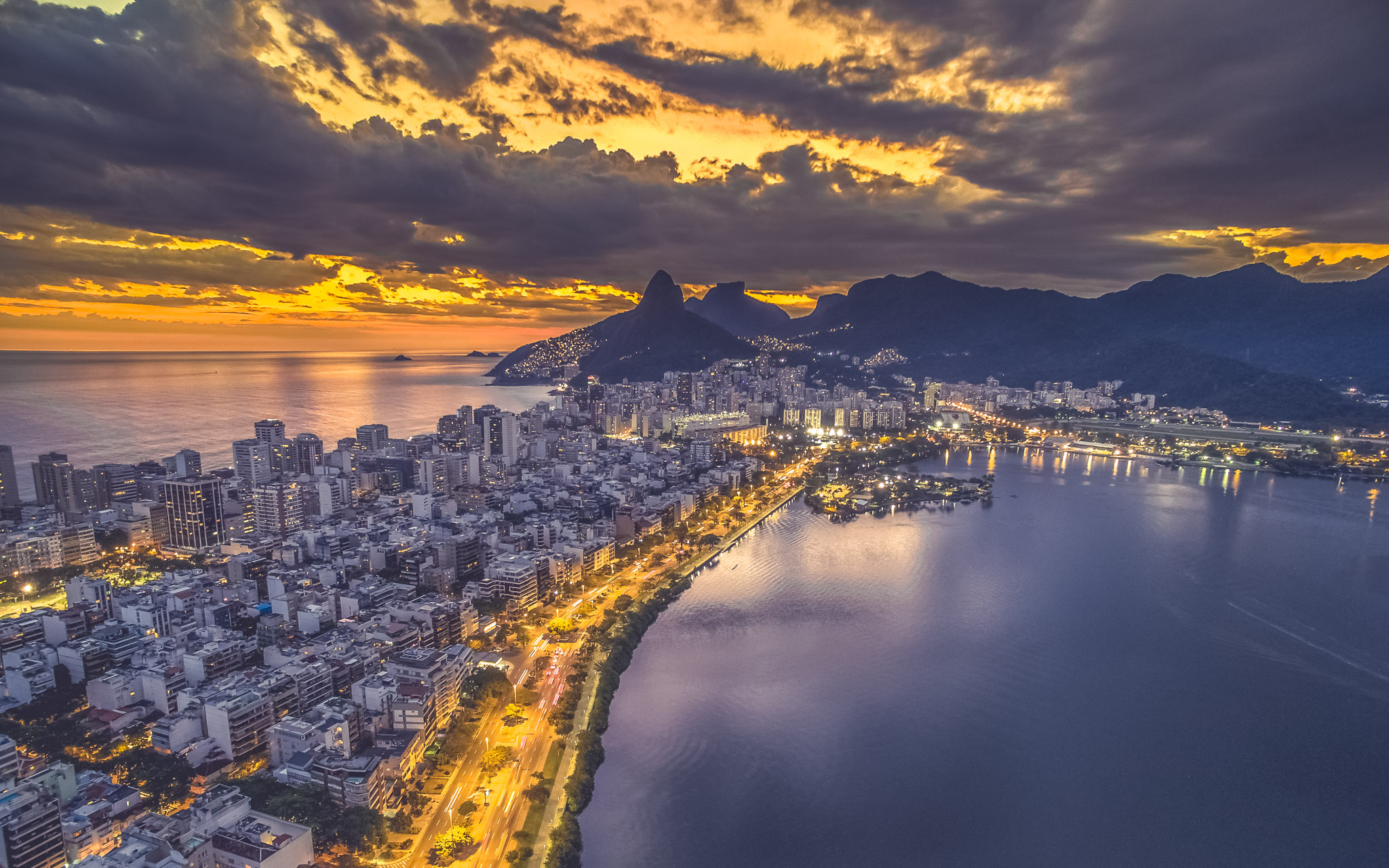 Incredible sunset in Rio de Janeiro, with a view of Lagoa Rodrigo de Freitas, beach of ipanema and the hill two brothers in the background.