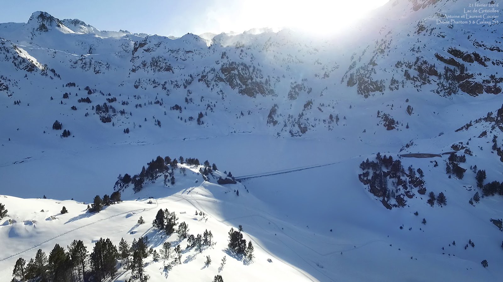 Deux de mes fils, Antoine et Clément, ont crapahuté avec moi en montagne, sans raquettes malgré l’enneigement (mais les conditions et l’itinéraire choisi le permettaient), pour filmer avec le drone ” Phantom-3 advanced ” des lacs gelés situés entre 2000 et 2100m d’altitude : le lac de Caderolles, le réservoir des Laquets, et le lac de Gréziolles (Hautes-Pyrénées). Pilotage depuis un smartphone Galaxy S3.