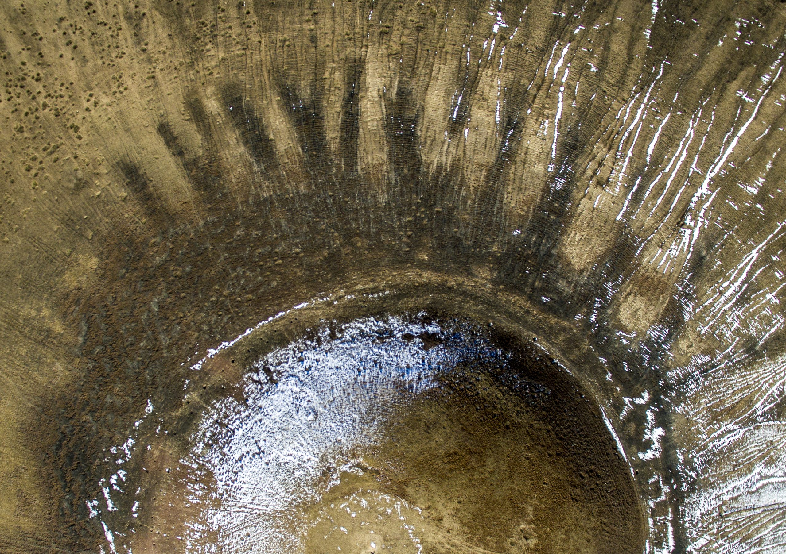 Look down to a volcano’s crater covered by snow