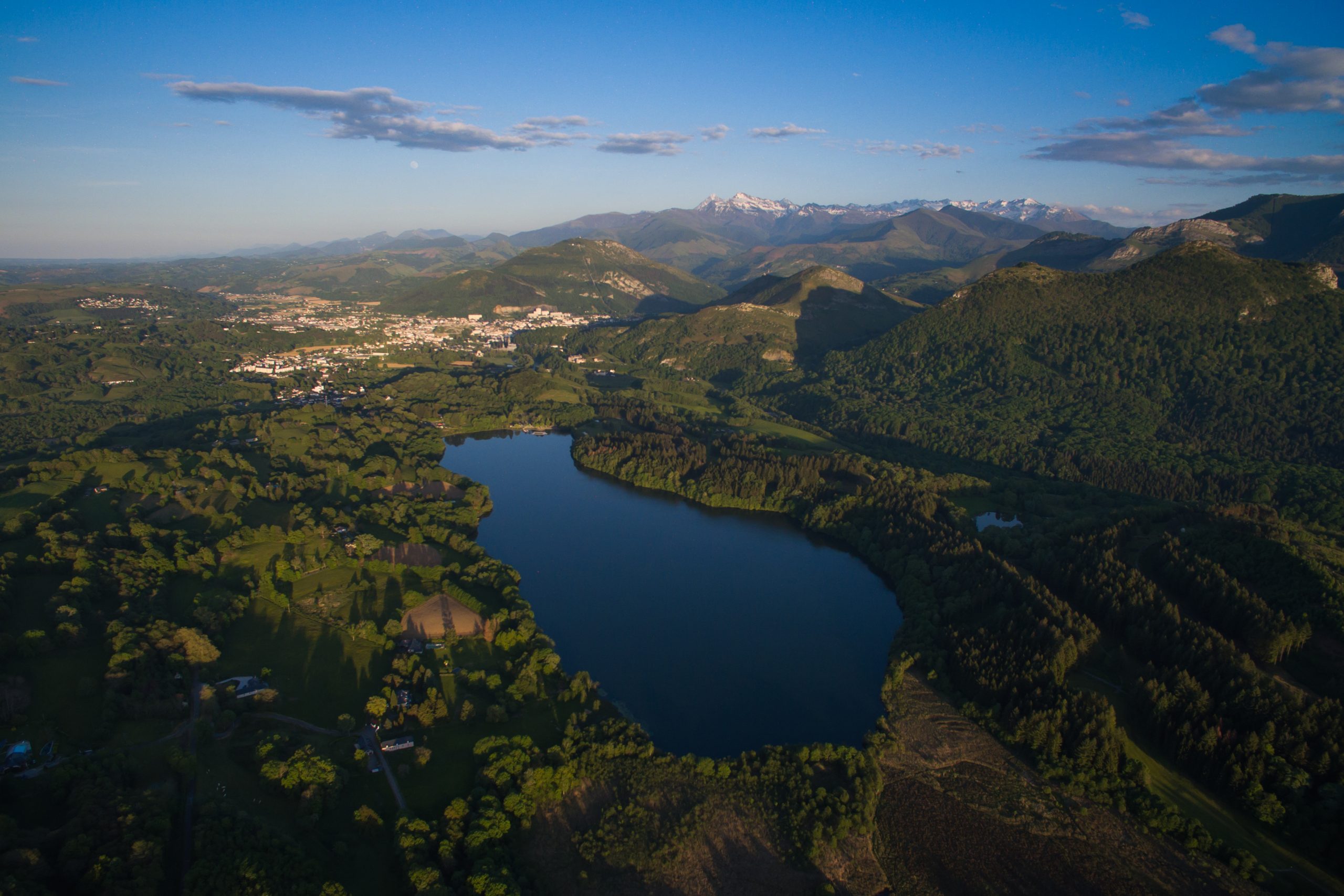 Sunset over Lourdes lake, in front of Pyrenees.
