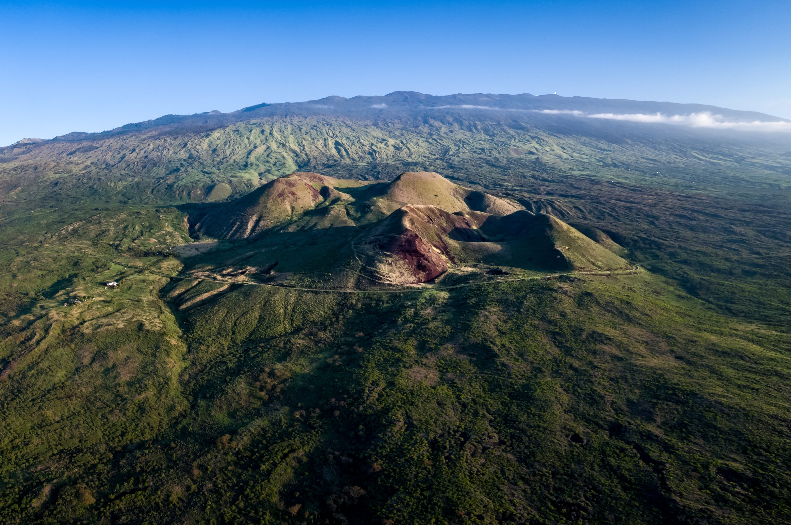 Morning light on a group of multi colored cinder cones that sit on the south side of 10,023 ft dormant Haleakala volcano, Maui, Hawaii. Cinder cones are also called pu’u and occur when trapped gas causes fountain-like eruptions during a lava flow. The falling lava cinders stick around the base of an eruption and a pu’u is formed. The most recent eruptions of Haleakala volcano occurred sometime between 1480 and 1600.