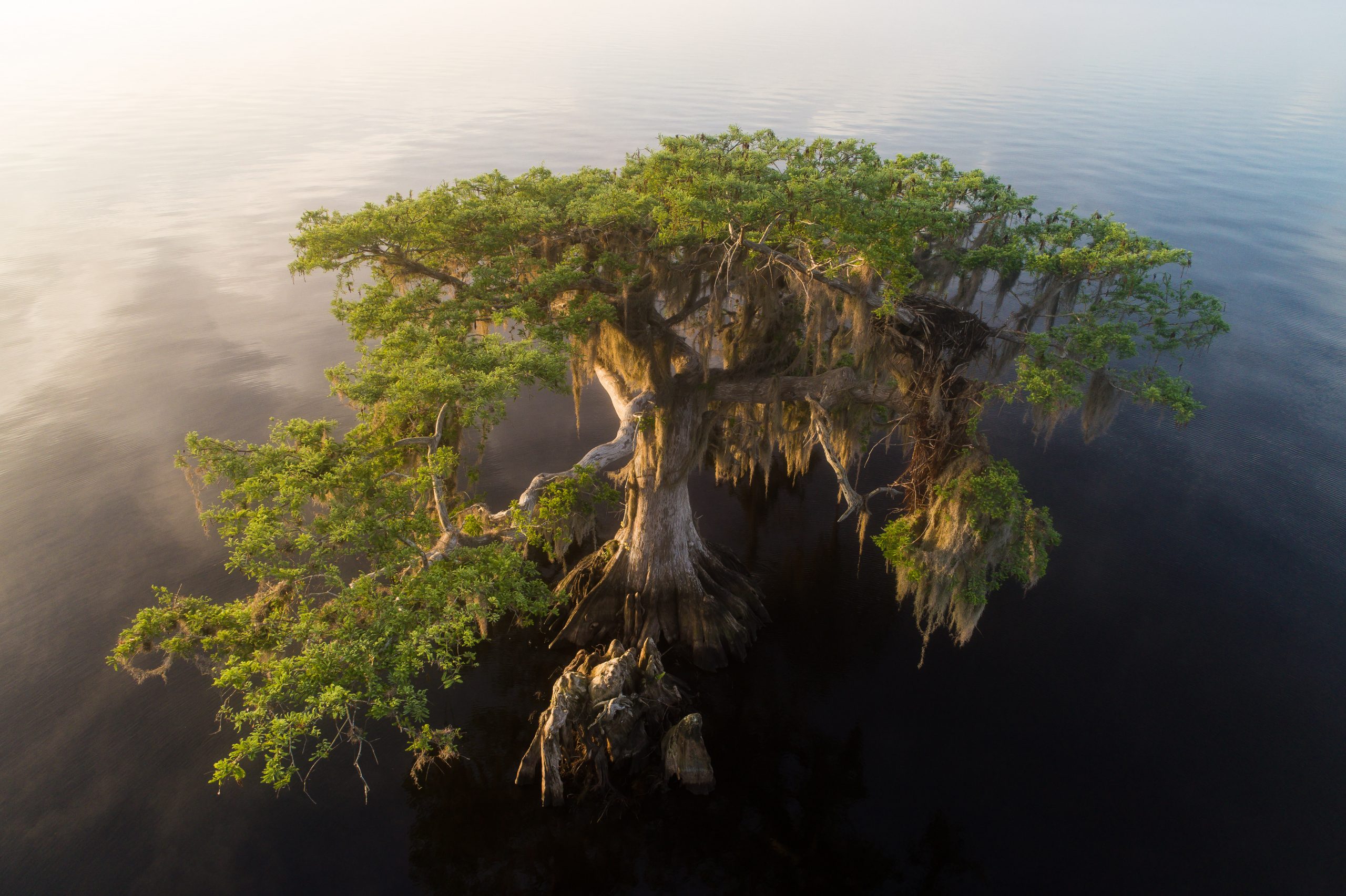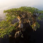 Majestic Cypress in morning mist at Blue Cypress Lake, Florida.