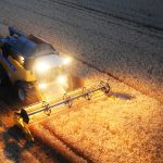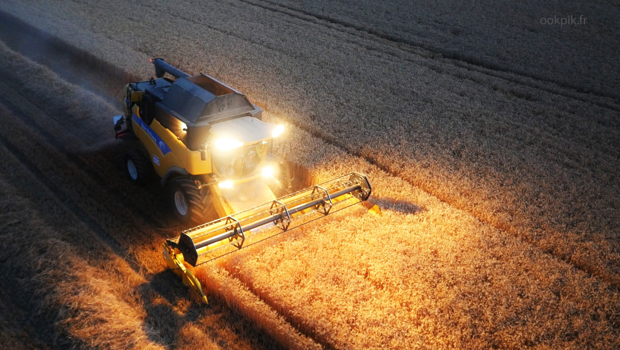Moissonneuse-batteuse New Holland dans un champ de blé, photo par drone. Combine-harvester in wheat field