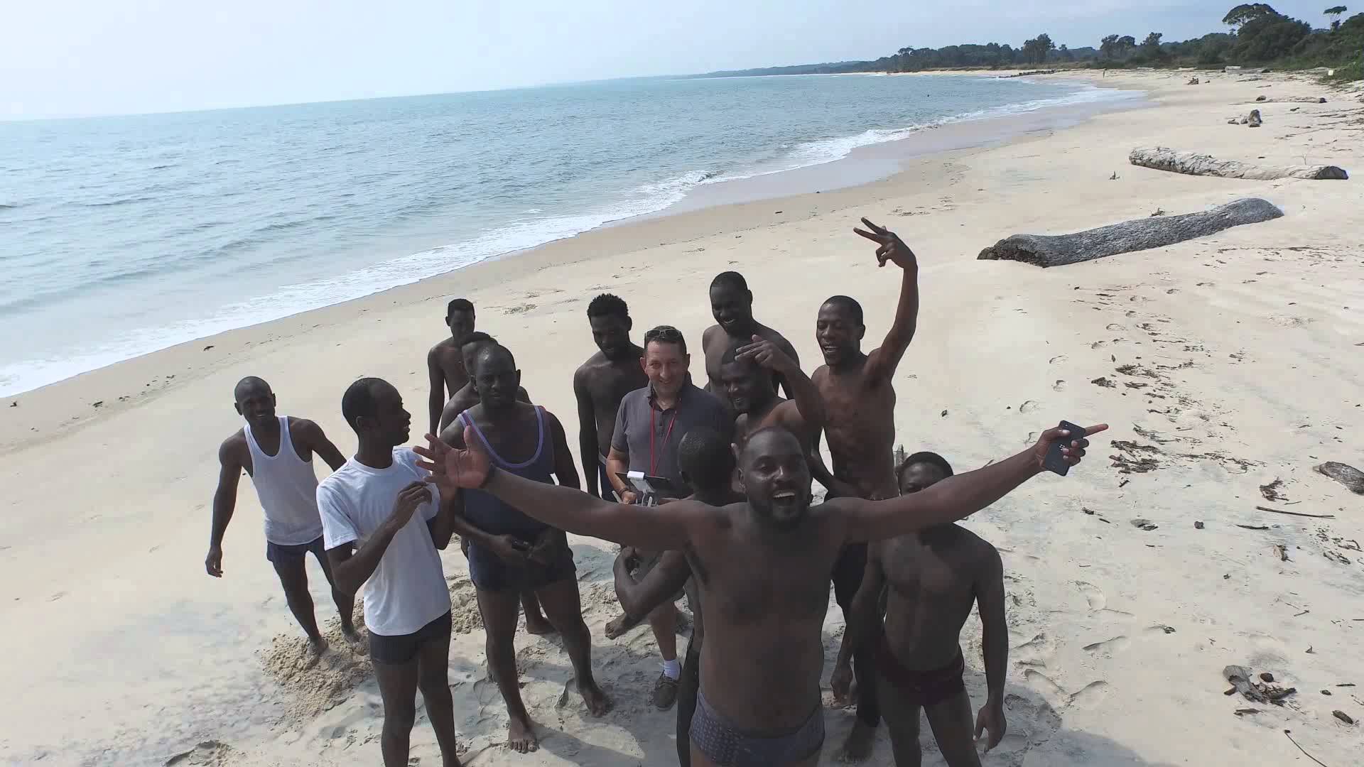 Friends who celebrates the birthday of their buddies M.Thierry on the beach of Nyonié in Gabon.