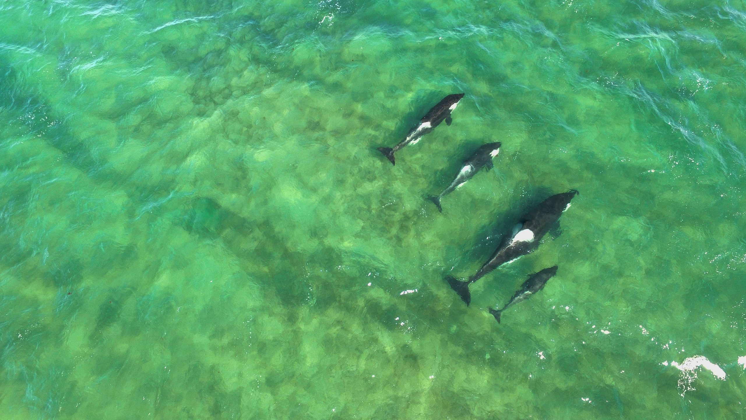 An Orcas Family swimming at Mar argentino. Punta Ninfas, Patagonia, Argentina.