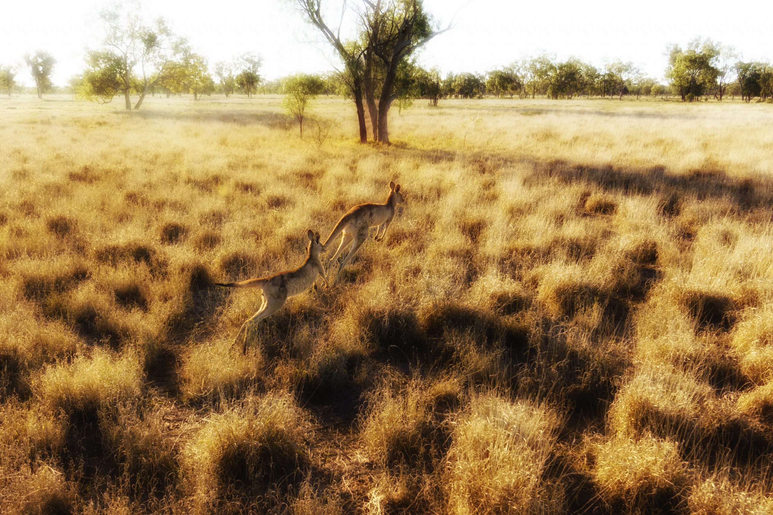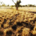 Kangaroos running in the outback at sunset