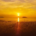 Paddleboarder, warm water, sunset.