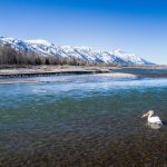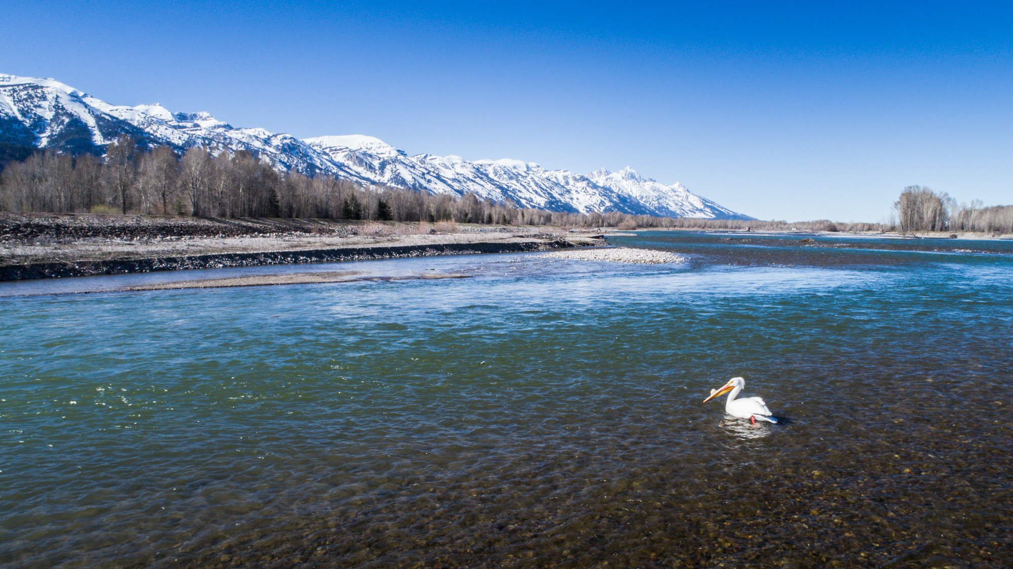 Looking very unfazed, this pelican lounges on a gravel bar with a view of the Tetons in Jackson Hole, Wyoming.
