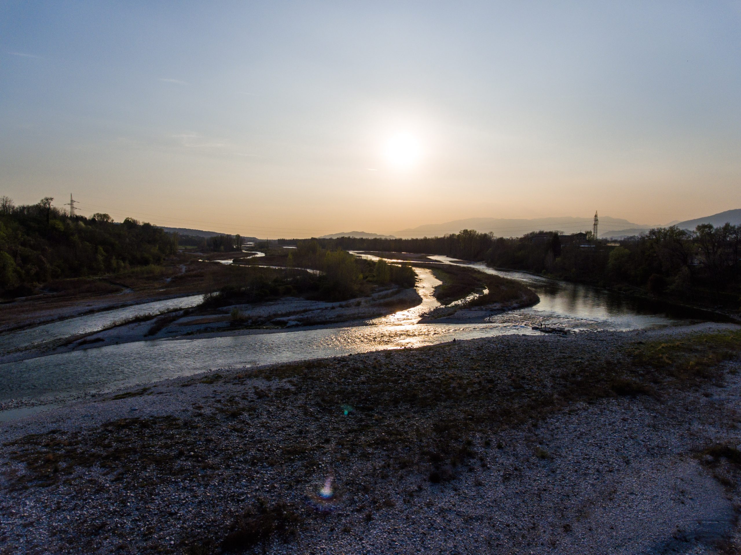 The sunset on the Piave river, near Montello hill and the village of Falzè.