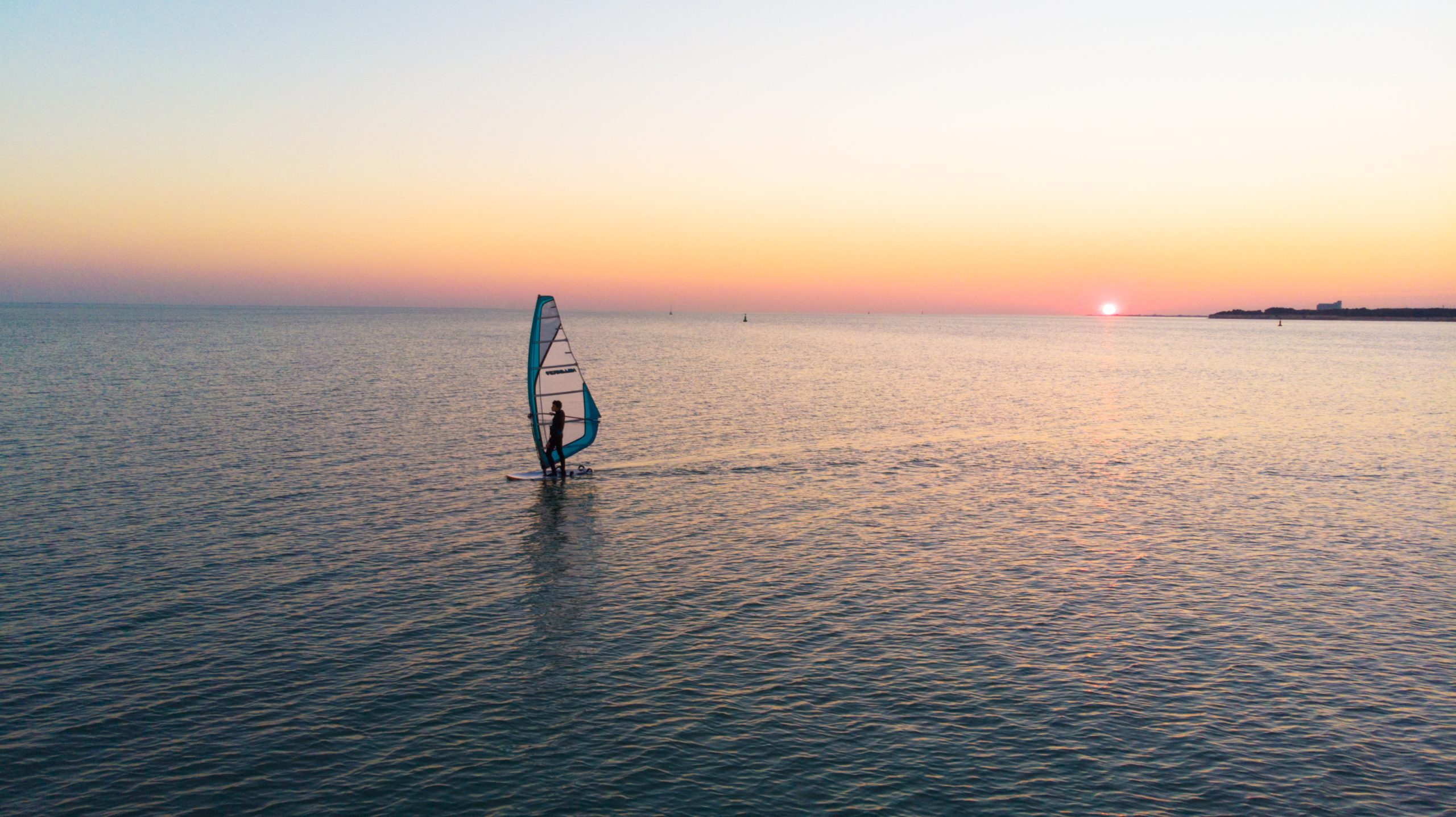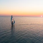 Débutant en planche à voile le soir au couché du soleil.