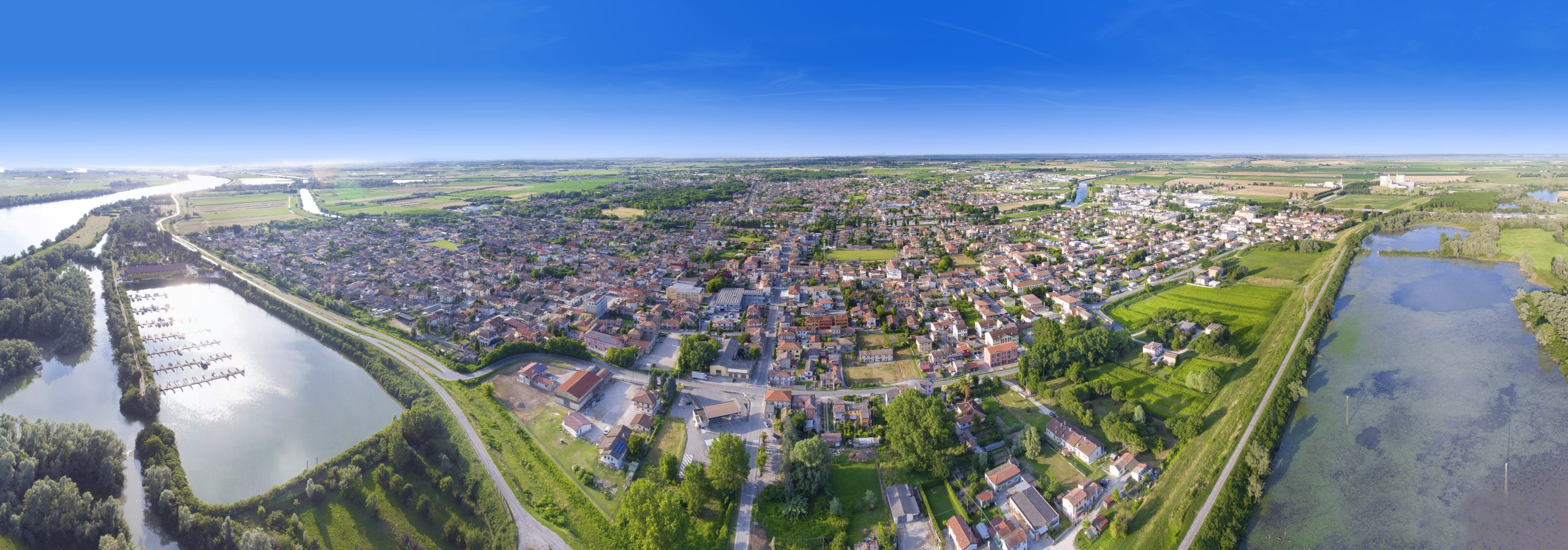 Vista da sopra il fiume Po verso la città di Porto Viro, Veneto, Italia.