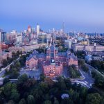 Flying near Queen’s Park in the University of Toronto. You can see the Ontario Legislative Building with the Toronto Skyline in the background.