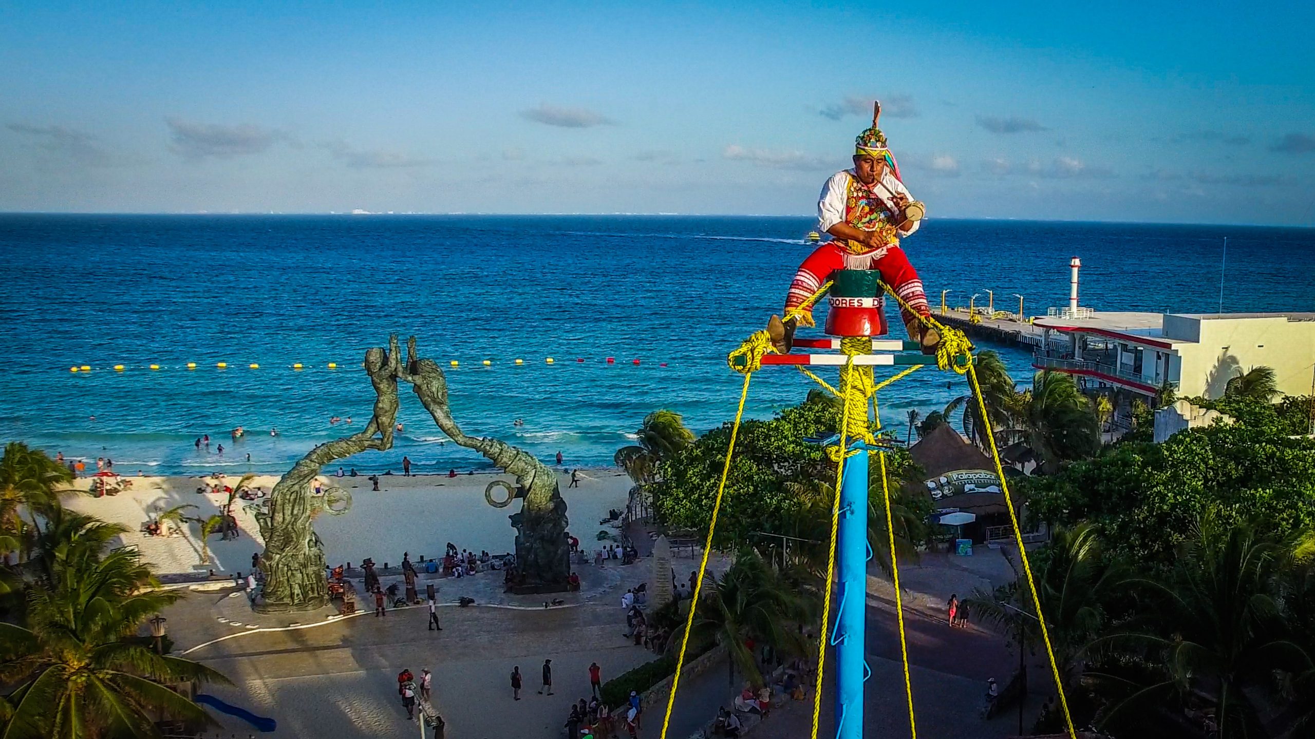 The dance of the flyers is a Mesoamerican ceremony in which five participants climb to the top of a 150 feet pole and then, suspended by ropes wound around the top of the pole, four of them fly through the air upside down as they are rotated and lowered to the ground. The fifth dancer remains at the top of the pole playing a drum and a flute. Flyers, known as voladores (flyers in Spanish), wear bright colored, traditional attire which highlights their dance (flying costumes originally were decorated with real feathers). This picture is of the Fifth Dancer.