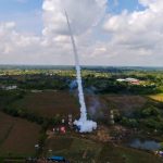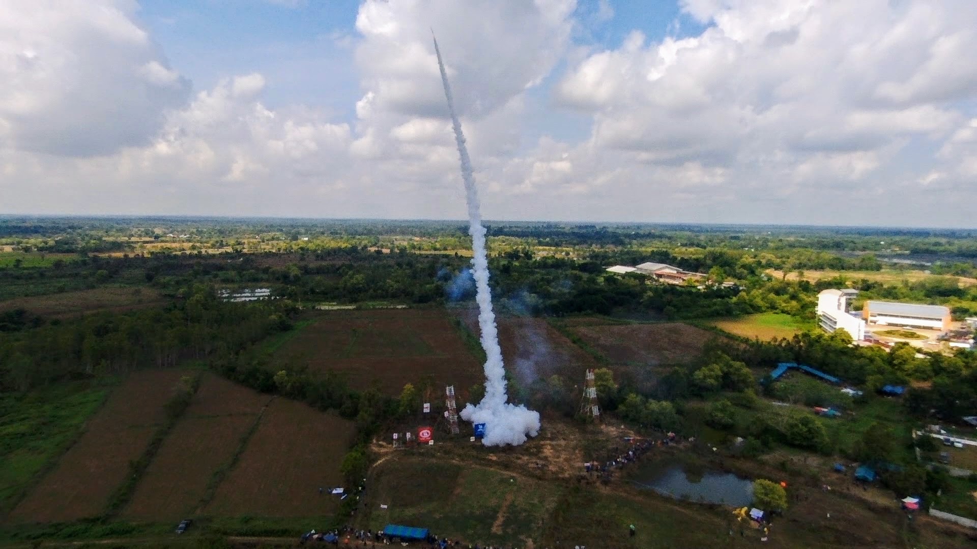 Competition rocket launch at the annual Yasothon Rocket Festival. This folk festival signifies the start of the rainy season in Northeast Thailand and Laos by launching rockets in the sky. During the festival, teams compete to launch rockets based on the highest, the farthest and prettiest vapour trails.