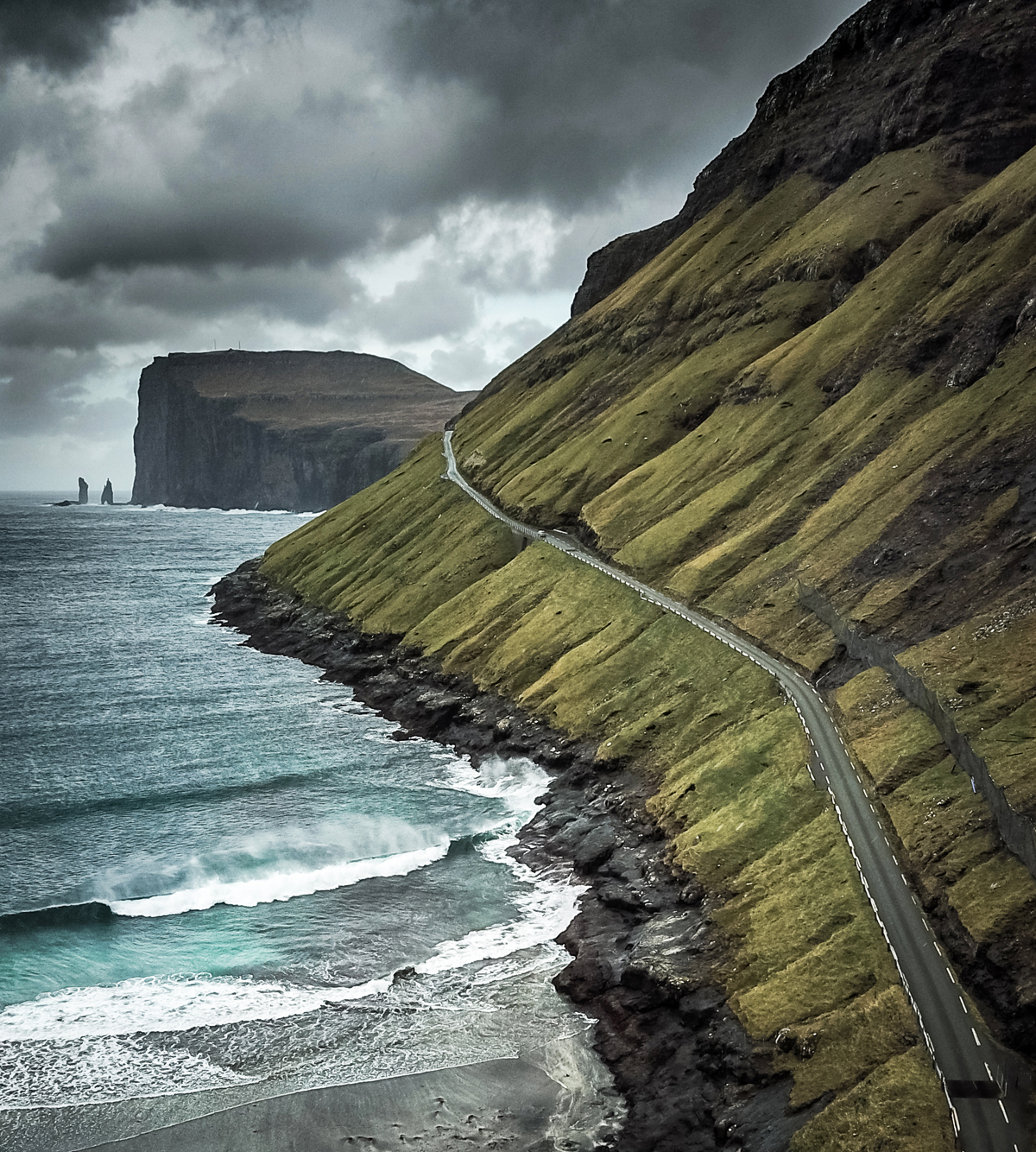This one is taken during my visit to the beautiful Faroe Islands this autumn. A piece of unexplored and unspoiled nature. On this photo you see the tiny road to the small village of Tjornuvik where the atlantic ocean breaks on the beach. Also you can see the famous seastacks called “Risin & Kellingin” in the background. Because of the high winds on the islands droning was kind of difficult but worth at all.