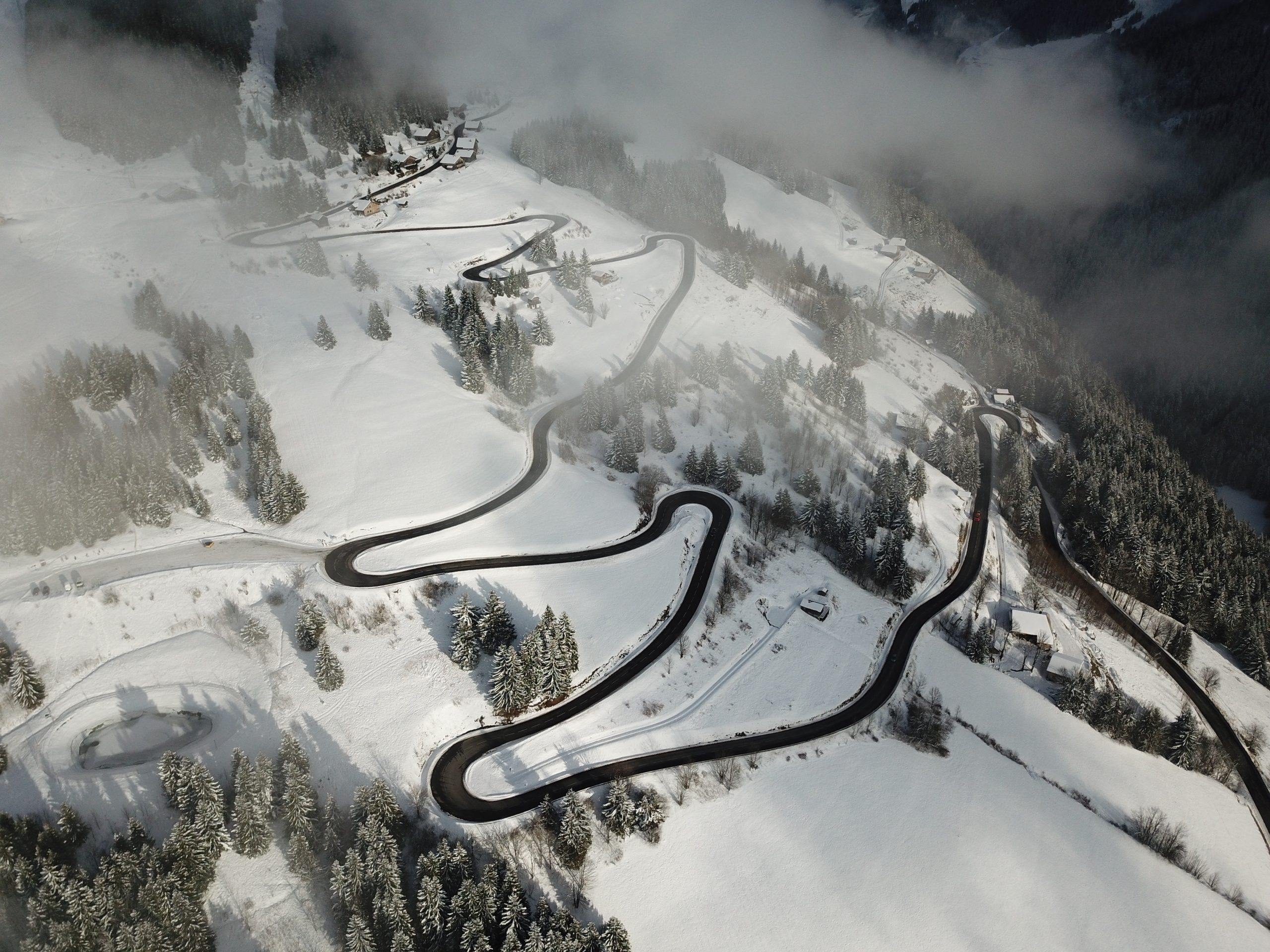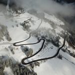 Aerial View Of A Car Driving Along a snowy S Curve From Wintry Davos To St. Moritz, Switzerland – Drone footage on HOsiHO.com