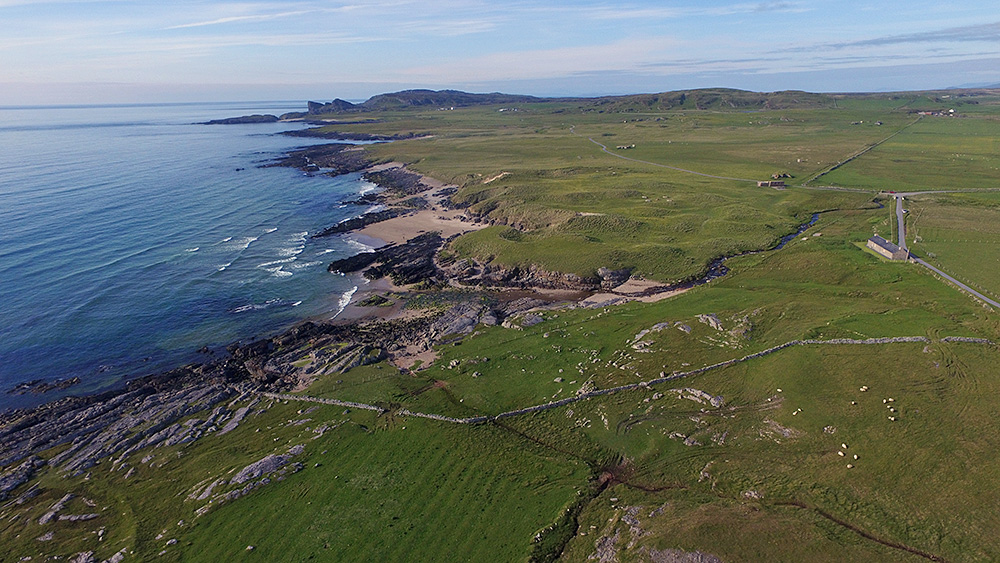 Saligo Bay, Saligo Cottage (on the right) and Smaull (in the distance) on the west coast of the Isle of Islay in Scotland from the air