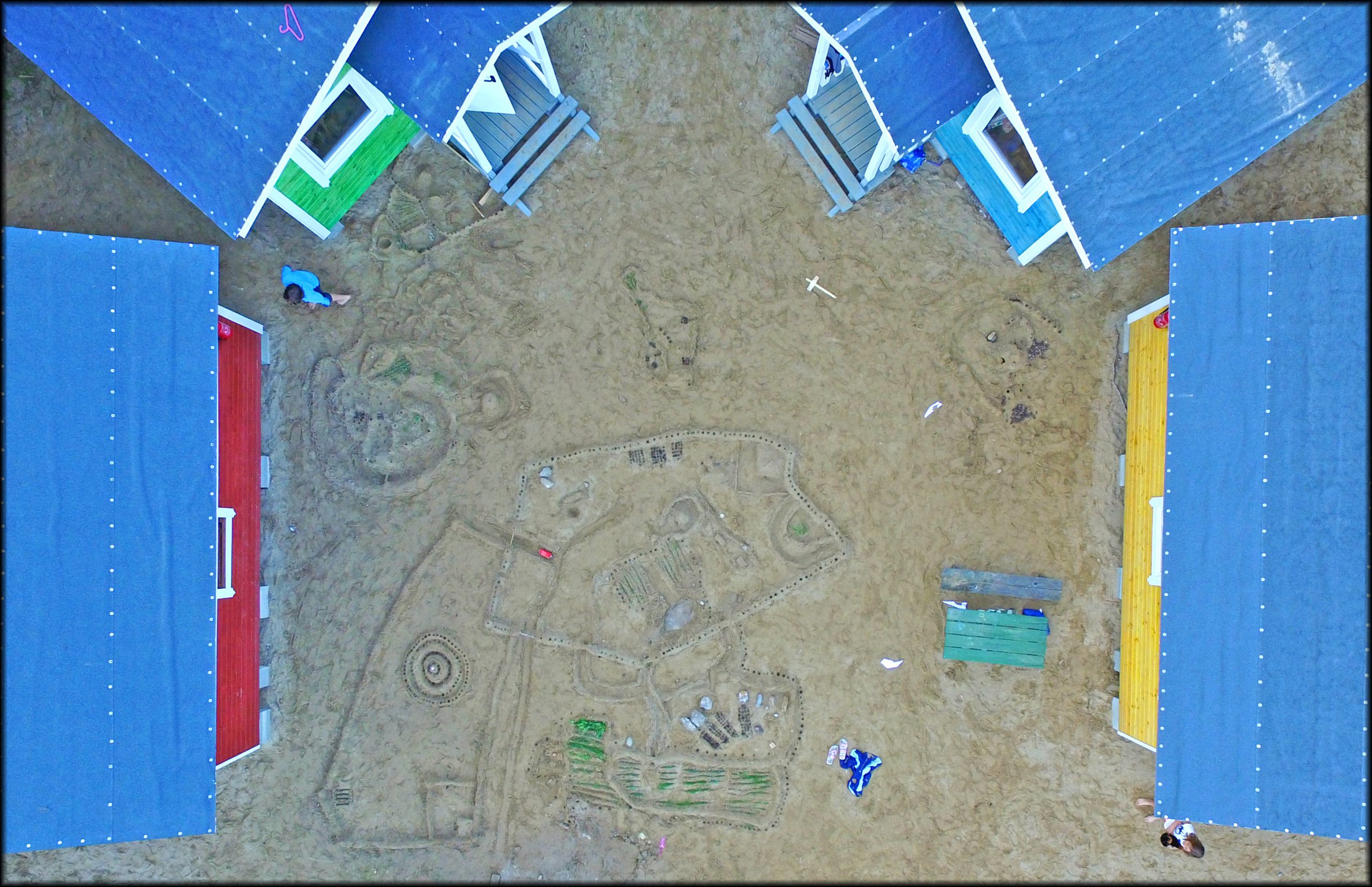 Kids proudly built this huge city (flipflops at bottom right for scale) during all day. Crops, palaces, graveyards, roads, bridges, even lava rivers. When the sun left they battled each other throwing pinecones to the neighbour’s soldiers.