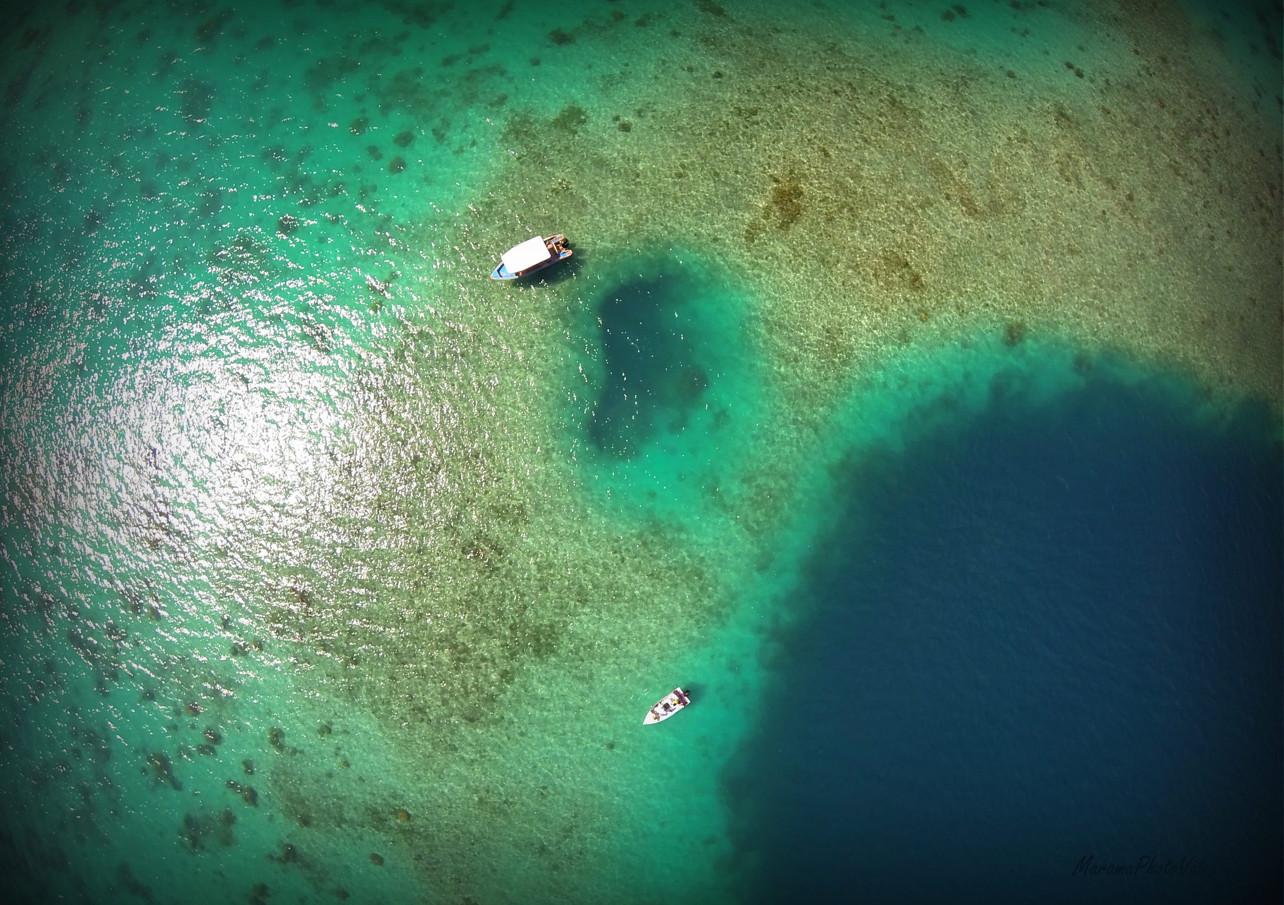 “Trou de la pieuvre” dans le lagon commun de Taha’a et Raiatea, deux îles perdues de Polynésie Française… Une grotte de 60m de profondeur qui s’enfonce dans le récif et qui fait la joie des plongeurs subaquatiques.