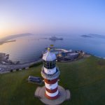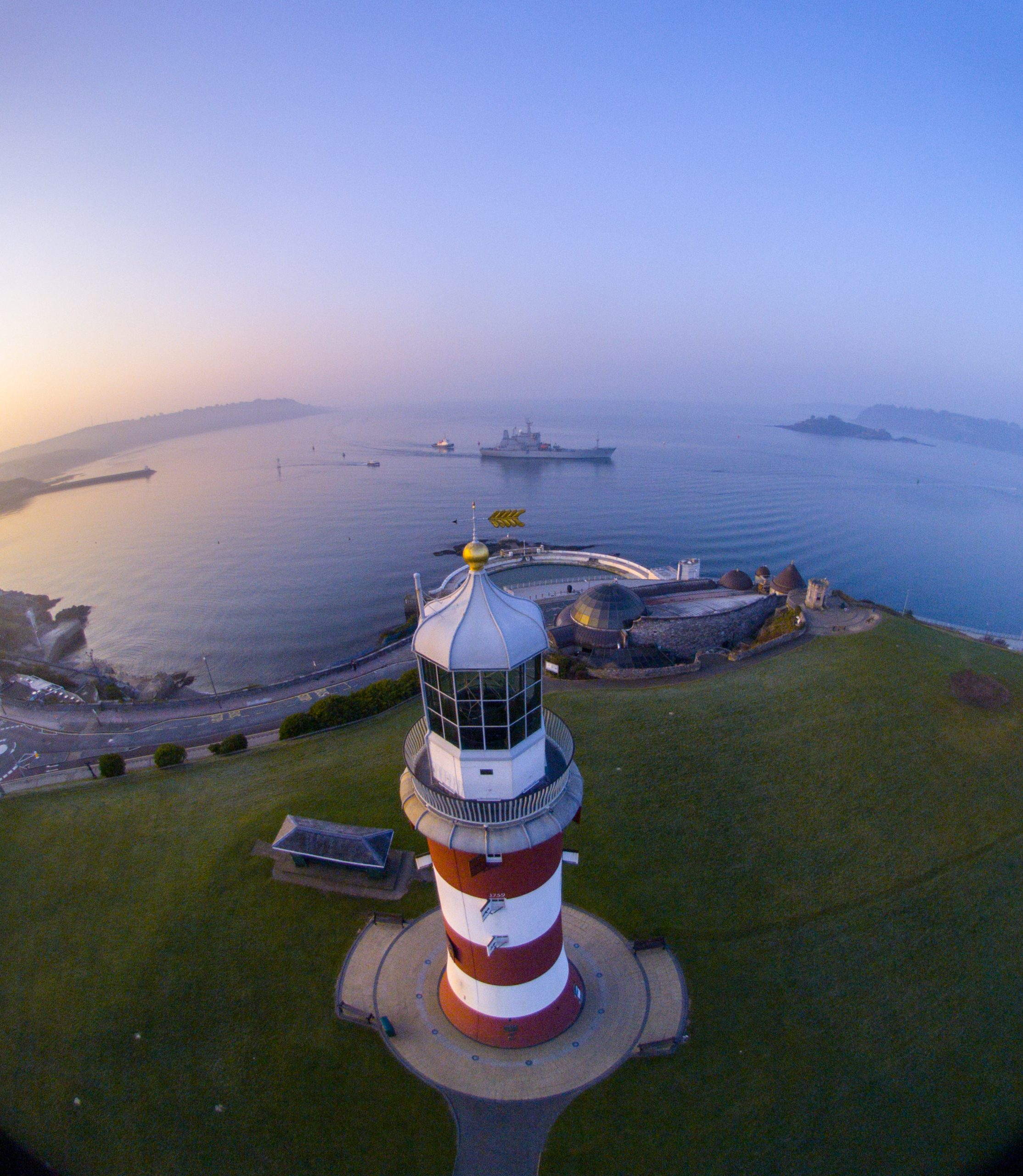 The famous lighthouse on Plymouth Hoe, with a warship coming into Devonport dockyard in the background