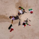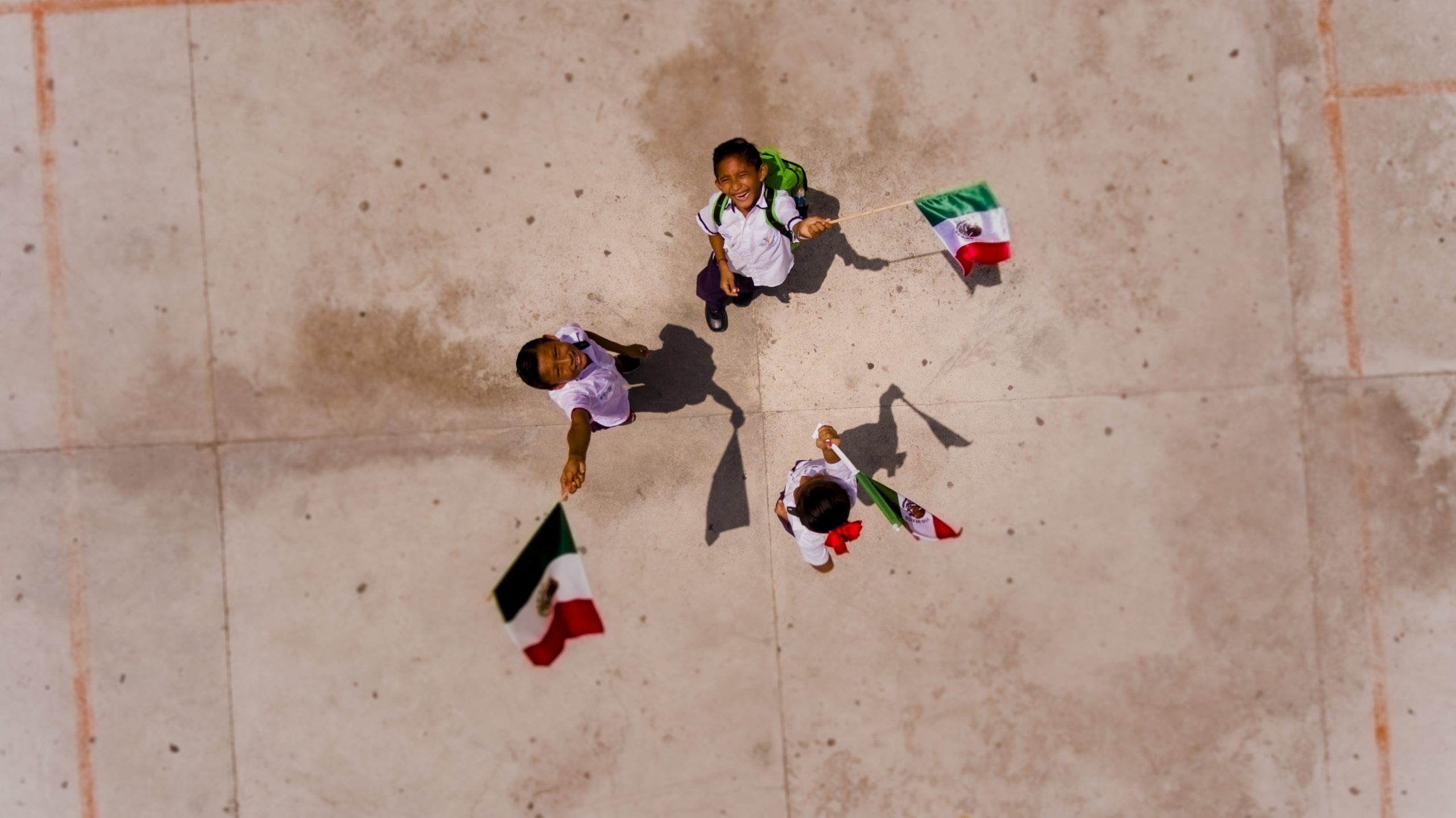 Unos niños saludan al drone al tiempo que portan orgullosos la bandera nacional