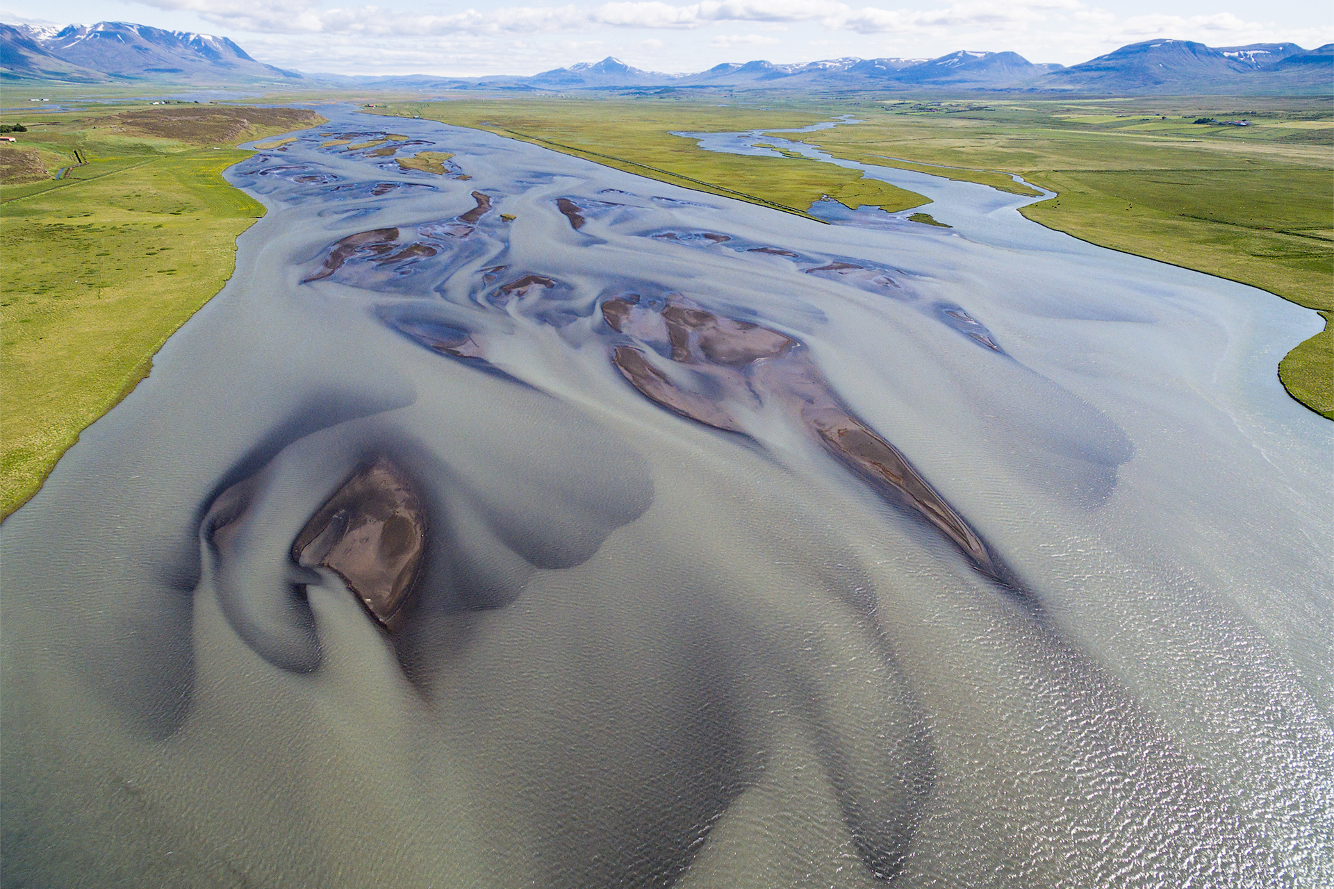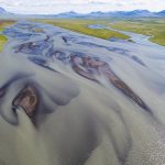 The glacial river Héraðsvötn in Iceland displays an impressive pattern of sandbars and shallow parts when photographed from above.